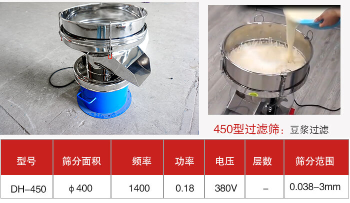 1、450過濾篩:時(shí)產(chǎn)量300公斤-500公斤/h,篩分粒度0.038-5,外形尺寸360×300×470mm。