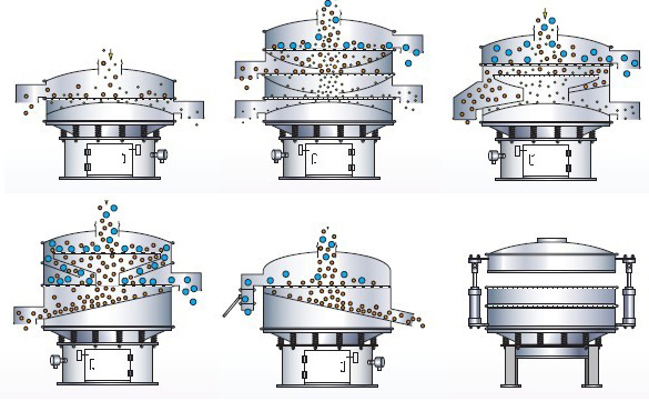 采用立式振動電機作為激振源,通過振動電機上下兩端的偏心重錘將旋轉(zhuǎn)運動轉(zhuǎn)變?yōu)樗健⒋怪薄A斜的三次元運動,并傳遞到旋振篩的篩面上;物料通過入料口進入設(shè)備內(nèi),根據(jù)不同物料篩分要求,物料經(jīng)過1-5層采用不同目數(shù)的金屬編織篩網(wǎng)的篩分層,在這個過程中,位于各層的篩網(wǎng)下的清網(wǎng)裝置(硅膠彈跳球)通過頻率振動不斷撞擊篩網(wǎng),使篩網(wǎng)上層物料能夠順暢的透網(wǎng)篩分,并有效解決了物料堵網(wǎng)問題出現(xiàn),不同目數(shù)的物料通過各層對應(yīng)目數(shù)的篩網(wǎng)后在各層的出料口排出,終實現(xiàn)篩選除雜或過濾分級的目的。