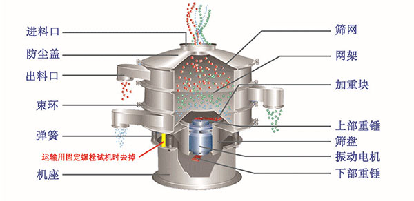 圓形旋振篩工作原理:物料從設備的進料口進入在振動電機的作用下使物料在篩網網孔的篩選后完成篩分目的。