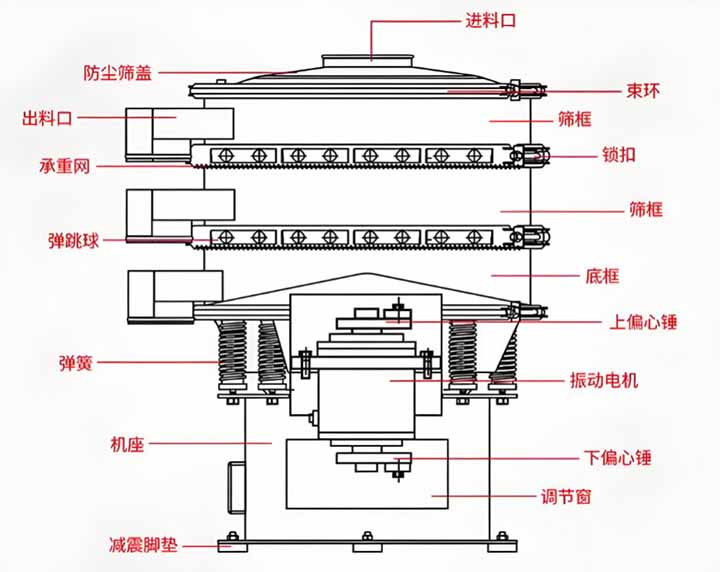 圓篩機主要結構由:篩框,振動電機,清網裝置,防塵蓋,束環,彈簧等部件組成