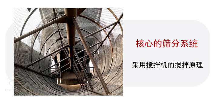 其核心的篩分系統采用攪拌機的攪拌原理,原料在攪拌筒內受連續螺旋葉片翻滾、推擠及物料間相互磨擦作用,作用強烈可靠性高。