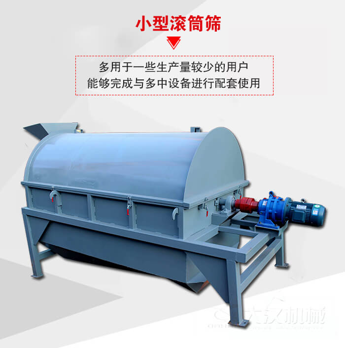 小型滾筒篩多用于一些生產量較少的用戶,與大型滾筒篩相比該產品的篩分直徑小,篩網面積小,驅動功率小,所以稱之為小型滾筒篩,但其改裝比較容易能夠完成與多中設備進行配套使用。