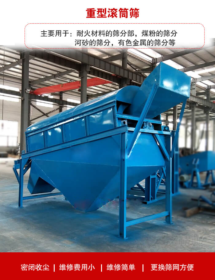 重型滾筒篩主要用于:耐火材料的篩分部,煤粉的篩分,河砂的篩分,有色金屬的篩分等。具有密閉收塵,維修費用小,維修簡單,更換篩網(wǎng)方便等特點根據(jù)不同用戶的篩分需求選擇:單層滾筒篩:主要分離出兩種粒度的物料。多層滾筒篩以及單層多段滾筒篩:可分離多種粒度的物料。