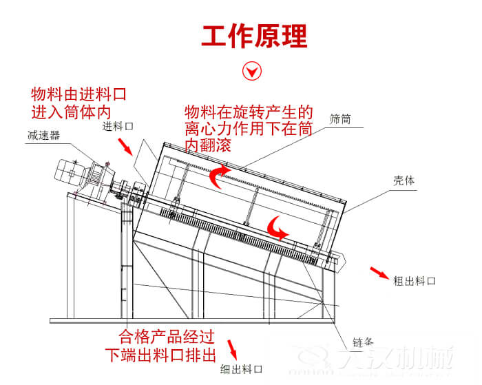 電機驅(qū)動滾筒軸線作旋轉(zhuǎn)運動,減速機調(diào)節(jié)筒體以一定的轉(zhuǎn)速旋轉(zhuǎn),物料由進料口進入筒體內(nèi),在旋轉(zhuǎn)產(chǎn)生的離心力作用下,物料在筒內(nèi)翻滾,自上而下通過分級篩網(wǎng)析出,由于篩網(wǎng)分級尺寸不同,物料逐漸被分離篩選,粒度合格的物料經(jīng)篩分后落入到各自的漏斗,然后由人力方式運出或通過輸送機自流送往成品站。合格產(chǎn)品經(jīng)過下端出料口排出,顆粒較大,分選不合格的產(chǎn)品經(jīng)另一排料口排出,筒內(nèi)清理裝置,使篩網(wǎng)不宜被阻塞。